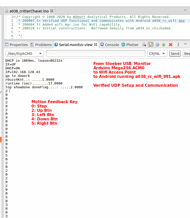 Mega 256 squirrel-chaser running the a038_critterChaser.ino appropriate squirrel-chaser behavior should be observed. Initial