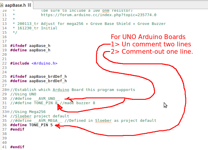 | For Uno Arduino boards | Shows the two significant changes that must be made to the aapBase.h header file. Then the default board type must be changed for the project within the IDE from mega256 to Uno. |